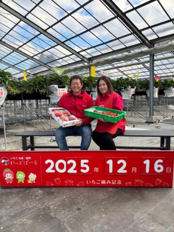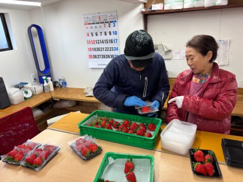 このパックに詰めた苺は市スタッフの安全と、商売の繁盛を込めて
