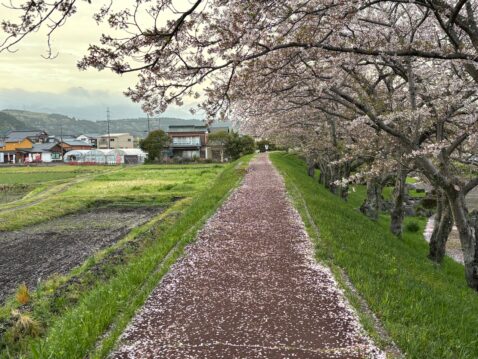 土手の桜も散り始め、いつもの散歩道が桜の花びらで埋め尽くされていました。